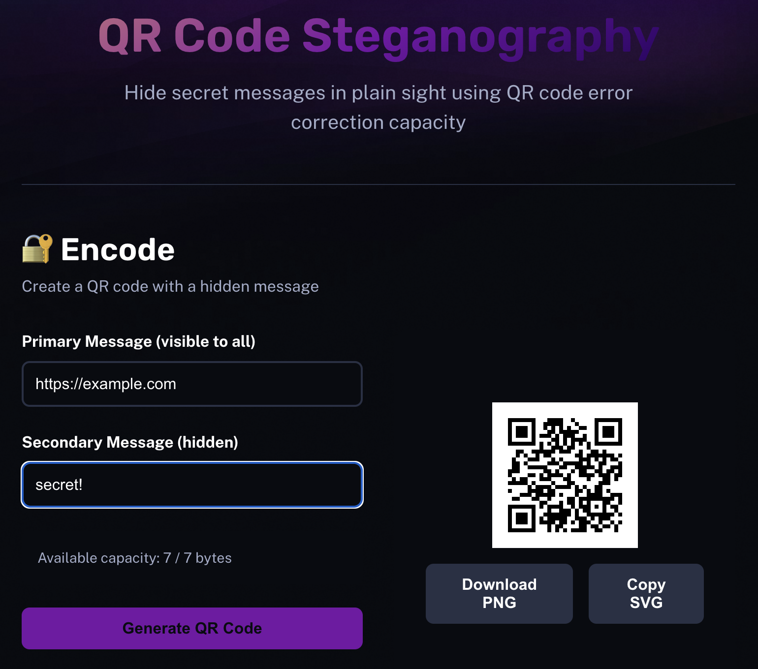 Hide secret messages in plain sight using QR code error correction capacity
