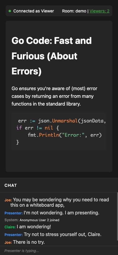 Presenter-oriented whiteboard using WebRTC. This project was primarily a way for me to learn about WebRTC. It uses PeerJS's free STUN server and lacks a TURN server so it will not work on all networks. For example, I can't even use two computers on my home network with it because my router is configured to block P2P connections. Note that the first user there will be the "presenter" who can type on the whiteboard; others are viewers.